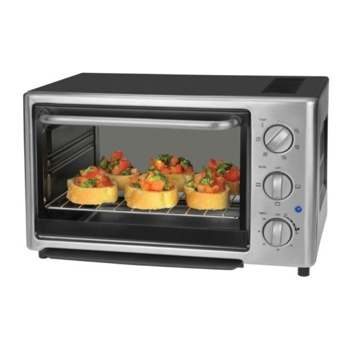 With its spacious 15-liter capacity, this convenient toaster oven makes it easy to keep up with the demands of any busy household. Its user-friendly control panel offers three dials for setting the heat, time, and function. The oven's temperature can be adjusted up to 450 degrees F, and its 30-minute timer shuts the unit off automatically after the elapsed time or can be set to the "stay-on" position. Use the toaster oven for anything from toasting up to four slices of bread at breakfast time to broiling a chicken, baking a casserole, or even a 9-inch pizza for dinner. Other highlights include toast-shade control from light to dark, a stainless-steel control panel and heating elements, black painted housing, a nonstick interior, an "on" indicator light, and a heat-resistant glass door for viewing the cooking process at a glance. Accessories include a broiling pan, broiling rack, a wire rack, and a slide-out crumb tray. The 1500-watt toaster oven measures 15-3/4 by 12 by 9-1/4 inches. Features: Stainlesss steel control panel Stainless steel front frame Stainless steel handle Silver or matt black painted knobs Toasting capacity : 4 slice or 9" pizza Interior housing capacity : 15L Broiling pan, broiling rack & wire rack Slide out crumb tray Non-stick coated cavity 60 min mechanical timer with continuous on position Heating element selector dial Temperature dial Stainless steel heating elements Ext dim. W 15 3/4" x D 12" x H 9" 1/4 with handle and feet Int. dim. W 11" x D 10" x H 8" 1/4 (Cavity).
